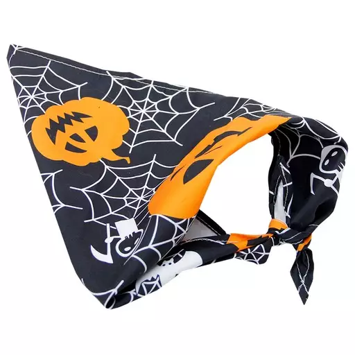Jos olet saanut lemmikkisi kanssa kutsun Halloween-juhlaan, on teemaan sopiva kolmiohuivi ehdoton hankinta. Hurjassa bandanassa komeilevat karmivat hämähäkinseitit, virnuilevat kurpitsalyhdyt, lepakot sekä viikatemiehet.