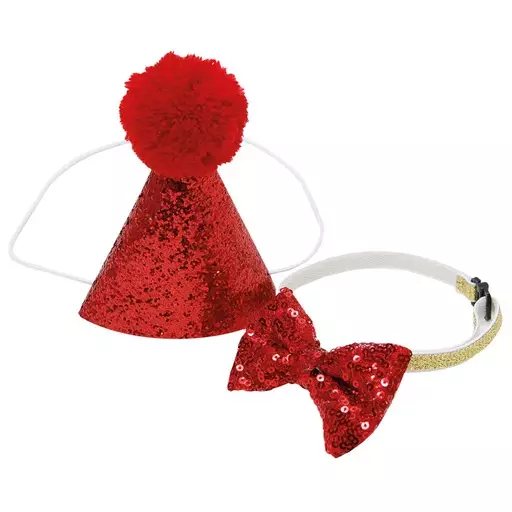 Iloisen punainen juhlahattu pysyy koiran päässä leuan alle tulevalla kuminauhalla, rusettipanta kiinnittyy pujotettavalla lukolla. Kimaltelevat punainen ja kulta sointuvat erinomaisesti esimerkiksi joulun tai uudenvuoden juhliin - tai miksei myös vaikka synttäreitä juhlistamaan.