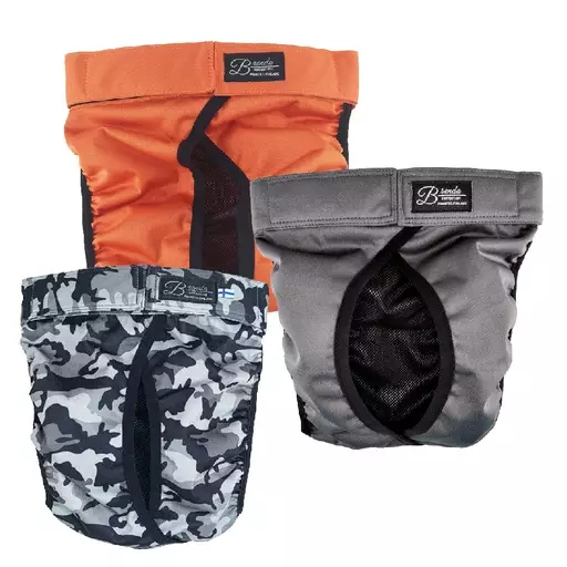 Erittäin hyvin istuva malli suojaa kodin tekstiililejä koiran juoksujen aikaan myös levottomamman koiran ohivuodoilta.