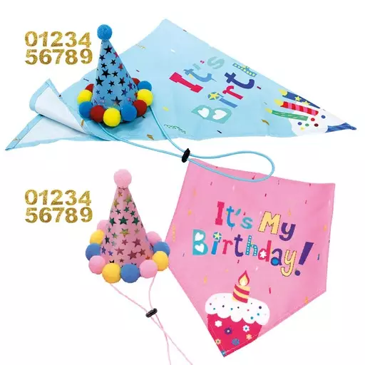 Suloinen synttärisetti sisältää hempeät asusteet parhaan ystäväsi syntymäpäiville! Pakkauksesta löydätte hauskan juhlahatun, hattuun sointuvan solmittavan huivin sekä tarranumerot 0-8 (2 kpl numeroita 1, numero 6 käännettävissä helposti numeroksi 9). Numerot voidaan liimata kiinni esimerkiksi juhlahattuun tai käyttää kakkukoristeiden askarteluun.