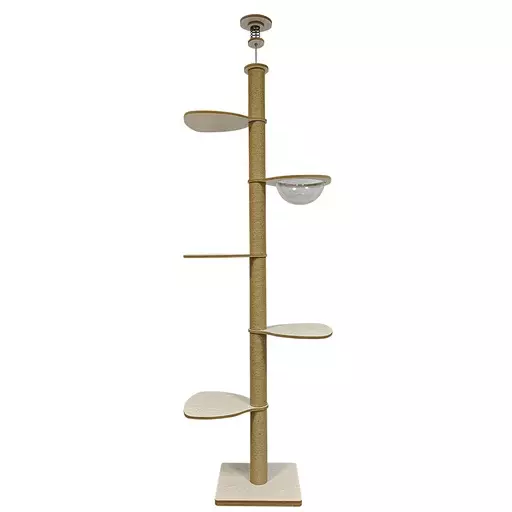 Kiipeilypuu pingotetaan katon ja lattian väliin, korkeus voidaan säätää huonekorkeuden mukaan välille 240-270 cm. Ennen kiipeilypuun käyttöön ottamista suosittelemme varmistamaan lisäkiinnityksen tarpeen erityisesti, jos omistat kookkaita tai hyvin riehakkaita kissoja tai jos puun alle jäävä lattiamateriaali on liukas. Tue kiipeilypuu tarvittaessa kiinnittämällä se esim. seinään tai pingota naruilla / liinoilla kiinteiden kohtien väliin.