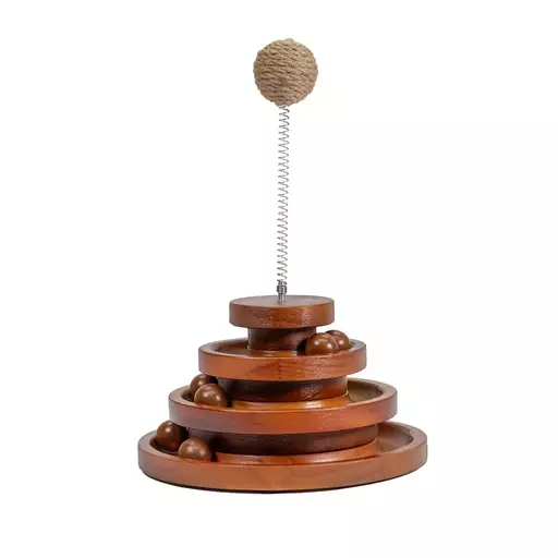 Lakatusta mäntypuusta valmistettu Cattivo -lelu tarjoaa kissallesi sekä henkistä että fyysistä haastetta. Kolmessa kerroksessa kiertävät pallot houkuttelevat leikkiin, ja jouseen kiinnitety juuttinarupallo viimeistelee hauskuuden. Lelu on kohtalaisen painava ja sen pohjassa on solukumitassut, jotka auttavat pitämään lelun paikoillaan ja estämään naarmujen syntymisen lattiaan. Leluun voi pallojen sekaan laittaa myös nameja tai vaikka kuivanappuloita.