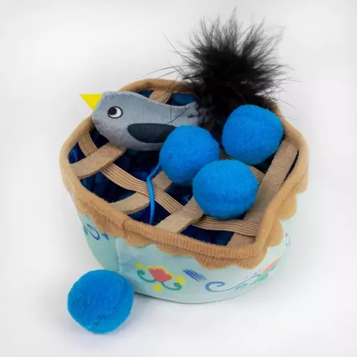 Lelu sisältää neljä "pehmomustikkaa", jotka houkuttelevat pyydystämään ja heittelemään niitä. Kakun rapisevat äänet tarjoavat pitkäkestoista ja innostavaa leikkimistä! ja sinne voi piilottaa makupaloja.