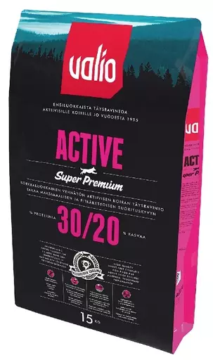 Valio Active on erityisesti harrastus- ja työkoirille suunniteltu tehokas täysravinto, joka tyydyttää aktiivisen koiran energiantarpeen. Ruoka sopii kaikenkokoisille- ja rotuisille koirille. Se on erinomainen valinta esimerkiksi reki- ja metsästyskoirille sekä näyttelykoirille, joiden lihakset vaativat ylläpitoa.