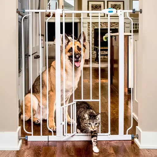 Erittäin kestävä, teräsrakenteinen Carlson Korkea Lemmikkiportti soveltuu erinomaisesti isommille koirille sekä koirille, jotka hyppivät paljon. Portti voidaan pingottaa oviaukkoon painekiinnitysjärjestelmänsä avulla karmeja säästäen. Kiinnikkeet kuuluvat pakkaukseen. Mikäli kokonaisuudesta halutaan entistäkin tukevampi, portti voidaan asentaa mukana tulevien, karmeihin ruuveilla kiinnitettävien kuppikiinnikkeiden väliin.