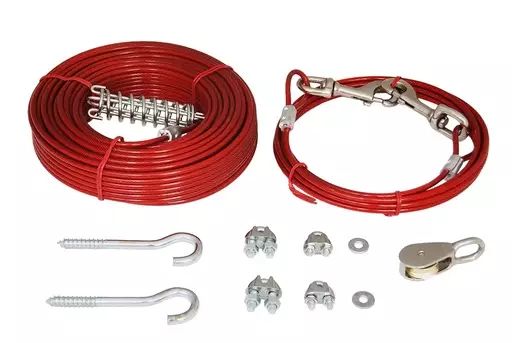Vahvaa ja kestävää, muovipäällysteistä vaijeria. Mukana 3 m pitkä talutinosa, jonka molemmissa päissä on pistoolilukot. Asennuskohteesta riippuen tarvitset muutamaa perustyökalua juoksunarun asentamiseen, muutoin pakkauksessa on kaikki tarvittava, myös kiinnityskoukut. Pakkauksessa asennusohje.