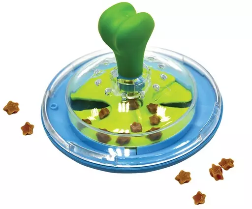 Laita namihyrrä pyörimään ja leikki voi alkaa!Helposti pienikokoisilla makupaloilla ladattava hyrrä tarjoaa viihdettä koiralle pitkäksi aikaa tarjoilemalla herkkuja koiran - tai omistajan - pyöritellessä ja heitellessä lelua. Hyrrän sisäosan vihreässä levyssä olevien avattavien namisektoreiden kokoa voi joko kasvattaa tai pienentää halutun vaikeusasteen mukaiseksi. Koira näkee makupalat hyrrän sisällä läpinäkyvän muovikannen läpi, mikä kasvattaa motivaatiota saada namit ulos. Hyrrä on valmistettu kestävistä synteettisistä ja turvallisista materiaaleista ja se sopii kaikille koirille.