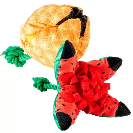 Lelut on valmistettu kestävästä oxford-kankaasta. Kankaan sisällä on pehmeä vanutäyte, joka antaa lelulle mukavan muhevan suutuntuman. Lelun sisäpuolella on fleece-elementtejä namien piilottamiseen sekä tarrat hedelmän sulkemiseen palloksi. Köydestä lelu on helppo heittää ja vastaavasti pienempikin koira saa siitä hyvän kanto-otteen.