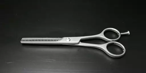 Kaksipuoleiset ohennussakset ruostumattomasta teräksestä. Irrotettava sormituki. 30 hammasta. Kokonaispituus 14,5 cm. Matta metalli.