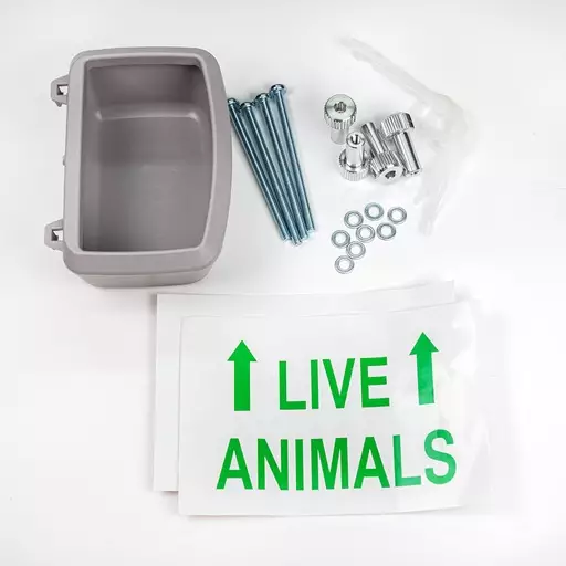 Pakkaus sisältää oven ritilään asennettavan kupin, pultit, sekä kuljetusboksiin lisättävät "Live animals" -tarrat.