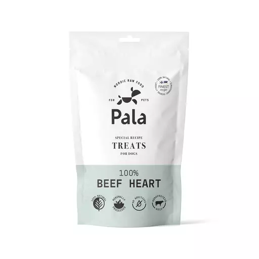 Pala Treats Beef Heart -makupalat ovat täynnä helposti sulavaa proteiinia ja aminohappojen, kuten tauriinin, B-vitamiinin (tiamiini B1 ja folaatti B9), raudan, fosforin, kaliumin, sinkin sekä seleenin lähde. Pala Treats 100% Beef Heart on ilmakuivattu pienissä erissä ja matalassa lämpötilassa, mikä säilyttää sen ravintoaineet ja maun erinomaisesti.