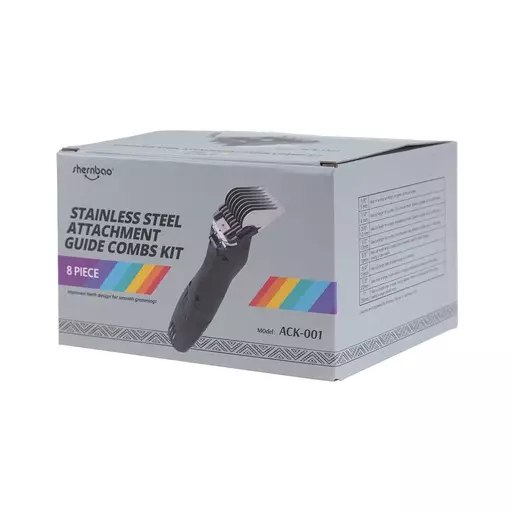 Jämäkät Shernbao ohjauskammat on valmistettu karkaistusta ruostumattomasta teräksestä kestävyyden takaamiseksi. Istuu napakasti ja turvallisesti paikalleen. Sopivat kaikkiin A5-tyypin irrotettaviin teriin (koot 10, 15 ja 30) ja ovat yhteensopivia useimpien Oster-, Wahl- ja Andis A5-mallisten trimmauskoneiden kanssa.