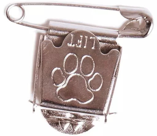 Perinteinen hakaneulalla kiinnitettävä kirkas metallipidike kilpailunumerolle. Leveys n. 2 cm.
