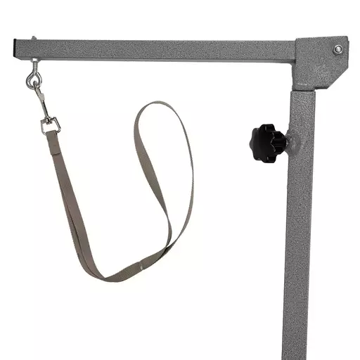 Trimmauspöydän talutinpidike, joka soveltuu käytettäväksi erilaisten trimmauspöytien kanssa. Talutinpidike kiinnitetään trimmauspöytään oman säätöruuvilla kiristettävän telineensä avulla. Koira kytketään kaulapantalenkillä pidikkeeseen, jolloin se pysyy pöydällä halutussa paikassa paikallaan ja hoitajan molemmat kädet säilyvät vapaina koiran trimmaamiseen. Pidikkeen korkeus on portaattomasti säädettävissä. Säilytystä varten, oksahaarake on taittuva, joten tanko mahtuu varastointia ajatellen pienempään tilaan kuin kiinteät.