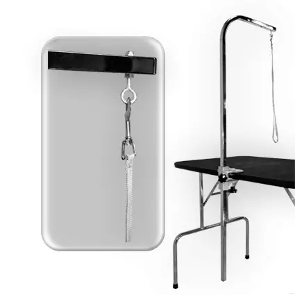 Trimmauspöydän talutinpidike, joka soveltuu käytettäväksi erilaisten trimmauspöytien kanssa. Talutinpidike kiinnitetään trimmauspöytään oman säätöruuvilla kiristettävän telineensä avulla. Koira kytketään kaulapantalenkillä pidikkeeseen, jolloin se pysyy pöydällä halutussa paikassa paikallaan ja hoitajan molemmat kädet säilyvät vapaina koiran trimmaamiseen. Pantalenkki on tuotteessa mukana. Pidikkeen korkeus on säädettävissä.